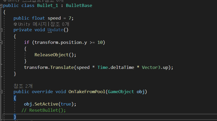 그리고 bullet 생성 함수에서 bullet 내부의 IObjcetPool pool에 spawn의 Pool을 넣어준다.