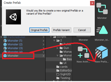 어떤식으로 저장할지 Create Prefab 창이 뜬다.