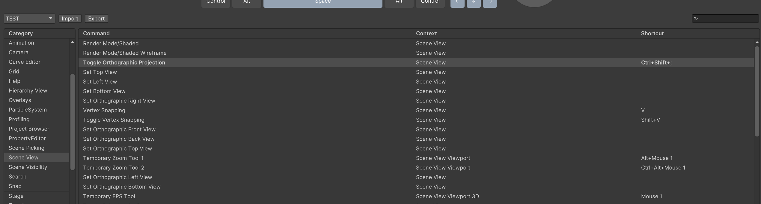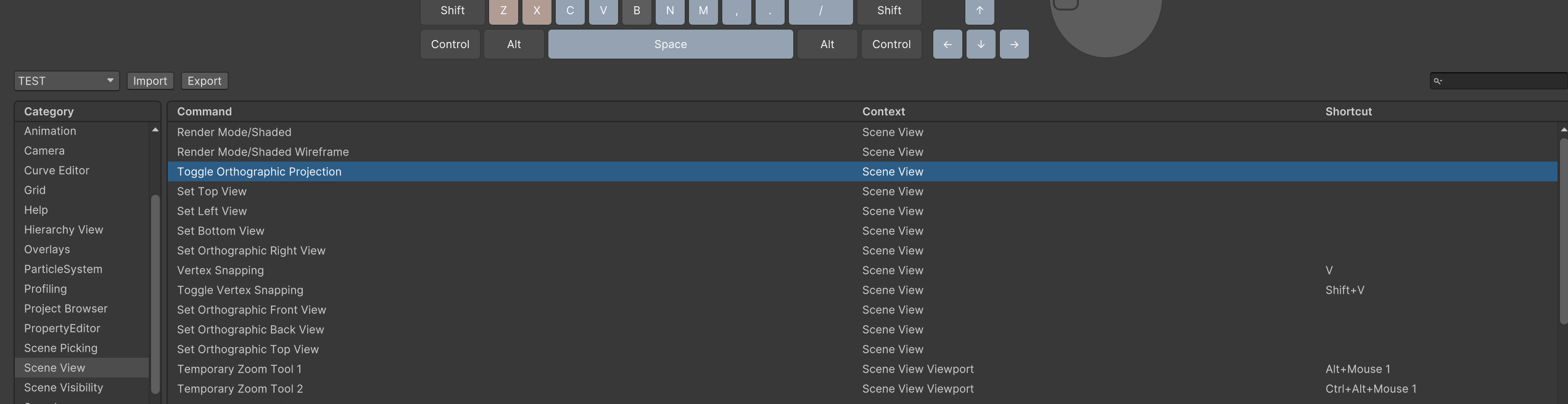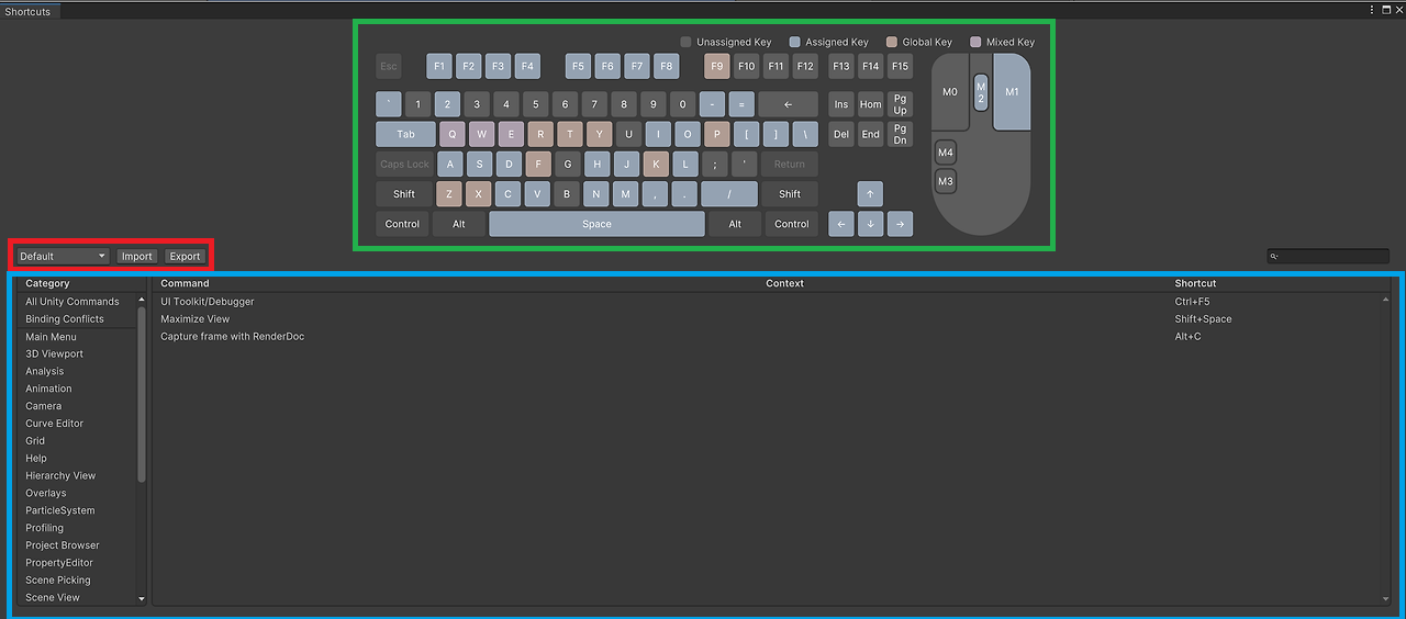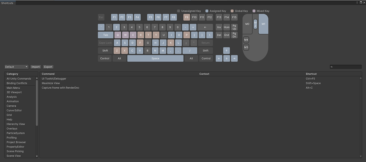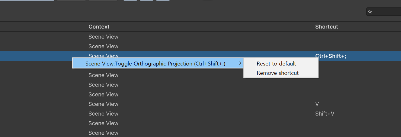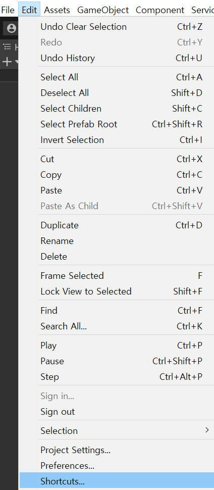 유니티에는 단축키를 쉽게 확인하고 단축키를 지정할수 있는 기능이 있다.